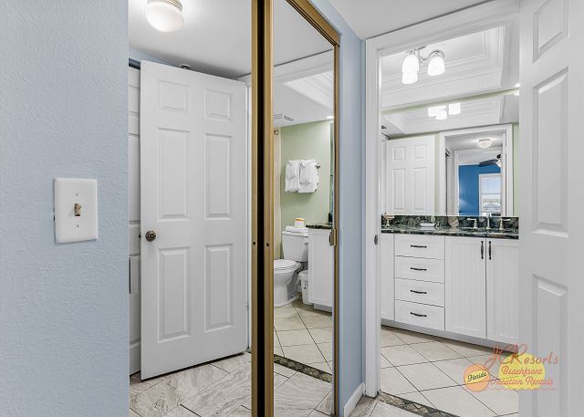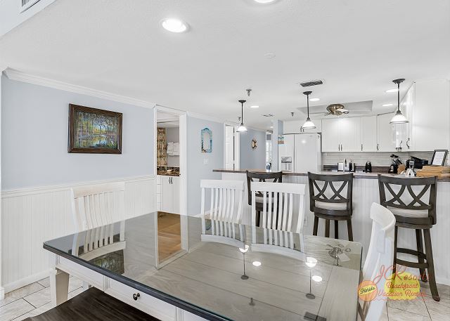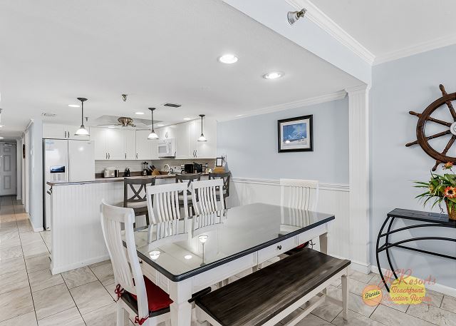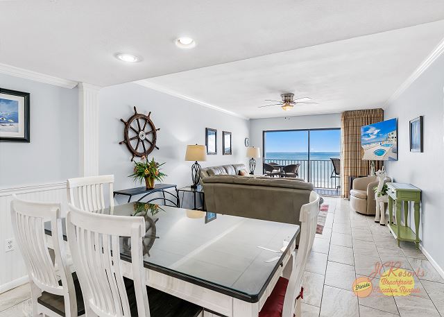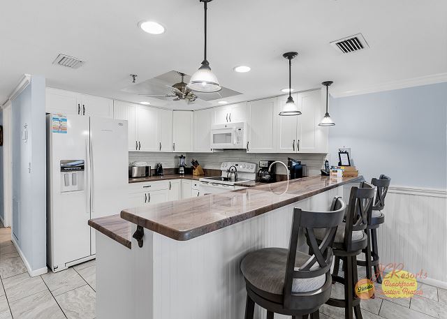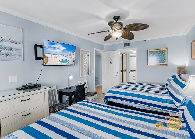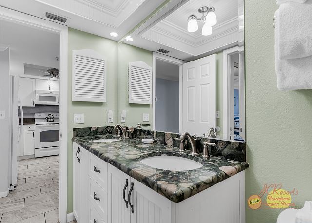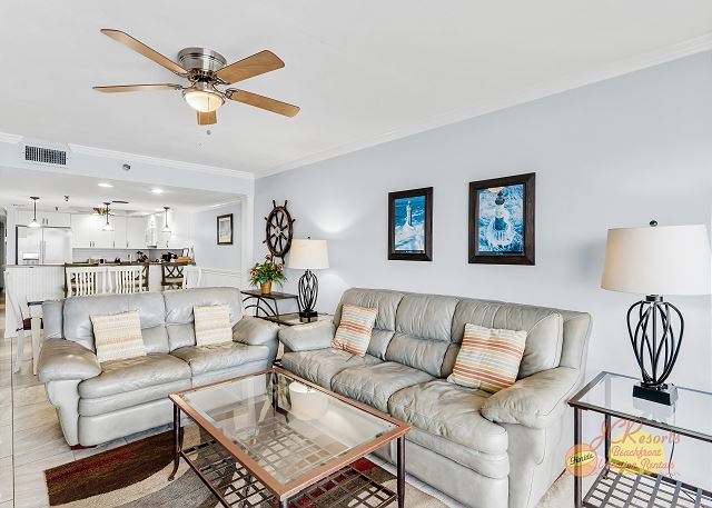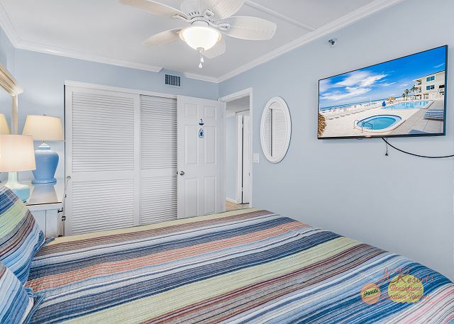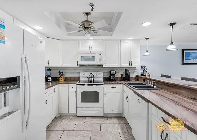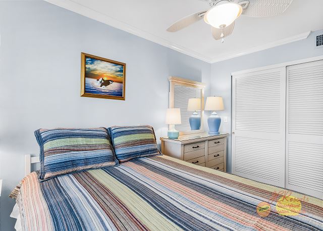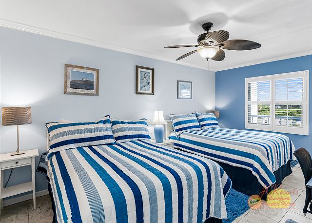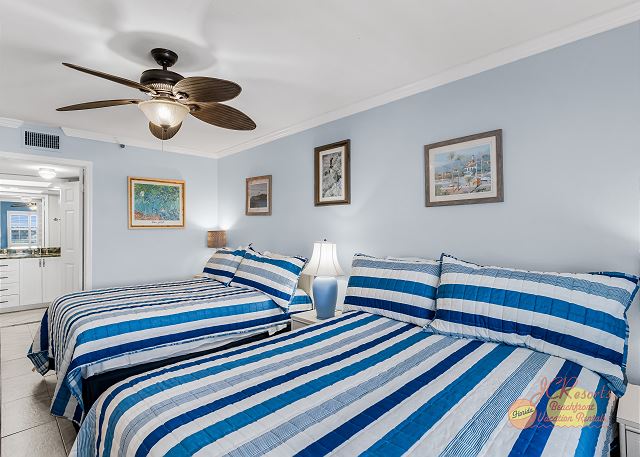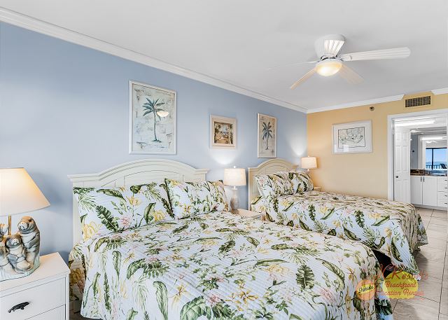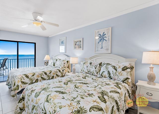 Sleeping accommodations include two queen beds in the main bedroom, 2 queen beds in the 2nd bedroom and a queen bed in the 3rd bedroom. Both bathrooms offer double sink vanities. The main bath offers a walk-in shower. Guest bathroom has a tub/shower combo. 407 has a Washer/Dryer, Central heat/air conditioning along with ceiling fans.