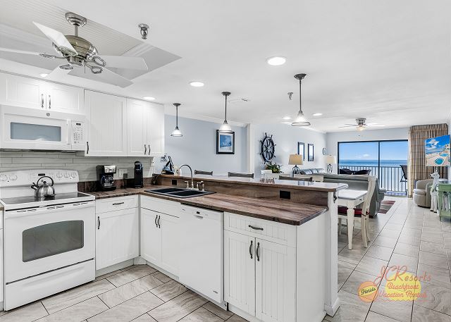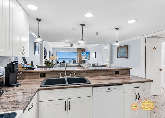 Vacation rental 407 offers a full size, fully-equipped kitchen complete with appliances including microwave and dishwasher, stocked drawers and cabinets...everything you need to enjoy dining at home. Flat Screen Cable TVs in the living room and all bedrooms, telephone with free local US and Canada calls along with free Wi-Fi are also provided.